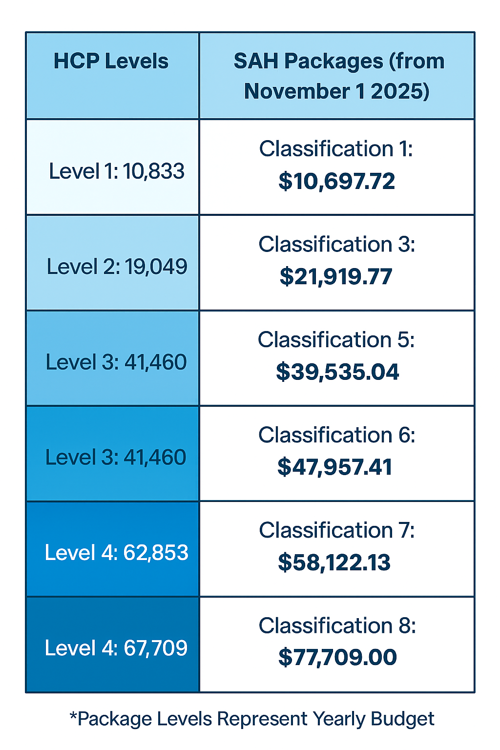 Under the old Home Care Package program, there are four levels of funding. The new Support at Home program introduces eight funding classifications, with each annual budget allocated in quarterly amounts.